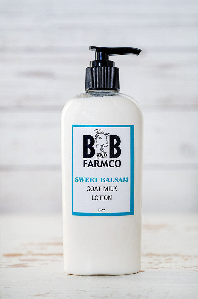 You will love the beautiful fragrance of our Sweet Balsam Goat Milk Lotion which has a mix of apple, fig, caramel, cinnamon, and balsam forest notes. Non-greasy, making it suitable for face, body and hands. 8oz pump top. Made with goat milk, distilled water, sunflower oil, emulsifying wax, shea butter, avocado oil, stearic acid, fragrance, optiphen*. *Paraben and formaldehyde free preservative. Made in United States of America
