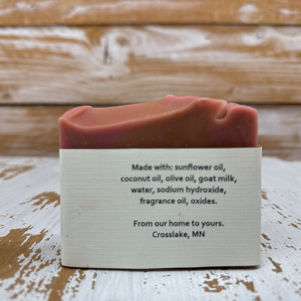 Made with: sunflower oil, coconut oil, olive oil, goat milk, water, sodium hydroxide, fragrance, natural colorant. 4.75 oz Made in the United States of America