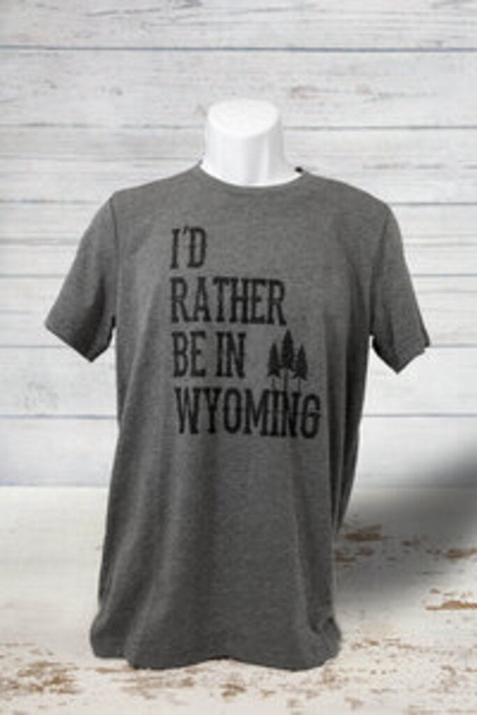 Rather Be in Wyoming Unisex Tee - Grey. This tee is a unisex fit with a cotton/polyester blend. Designed and hand printed in Montana with black ink.
