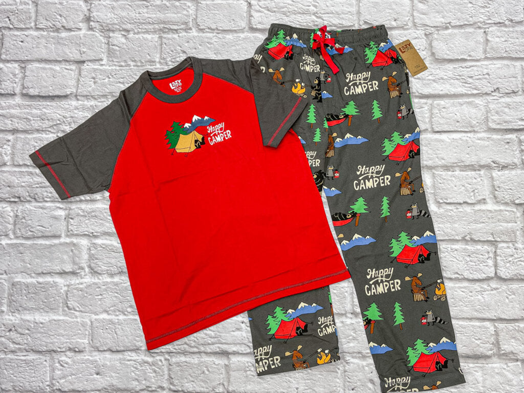 Don't forget your pajamas on your next camping trip, or just a trip to your bed! This roomy men's pj tee is red with grey raglan sleeves, and their thinner fabric makes this tee great to sleep in. Made for both men and women, these Happy Camper pants have a fly, a drawstring and pockets. Get pajamas for the whole family with our Happy Camper matching family pajamas. Purchased as a set. Adult sizes: XS-XXL