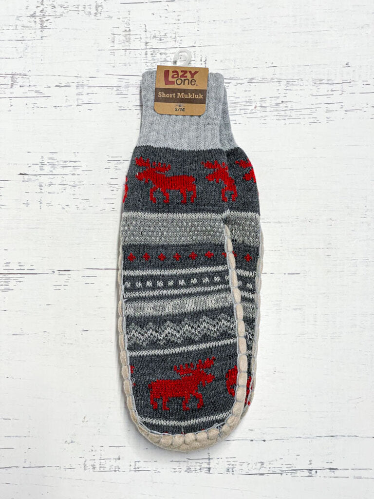 Our Cabin Moose Short mukluk gives you all the comfort you will need in a shorter mukluk. Featuring our dark moose fair isle design, it will had some style to outfit. These cozy mukluks are double-layered for extra warmth, coming to just above the ankle with a snug top. And in imitation of the trends set by the Eskimo and Inuit, each faux suede leather slipper is hand-stitched for an authentic mukluk look! When it comes to functional footwear, we've got all the right styles from the lands of the frozen chosen.