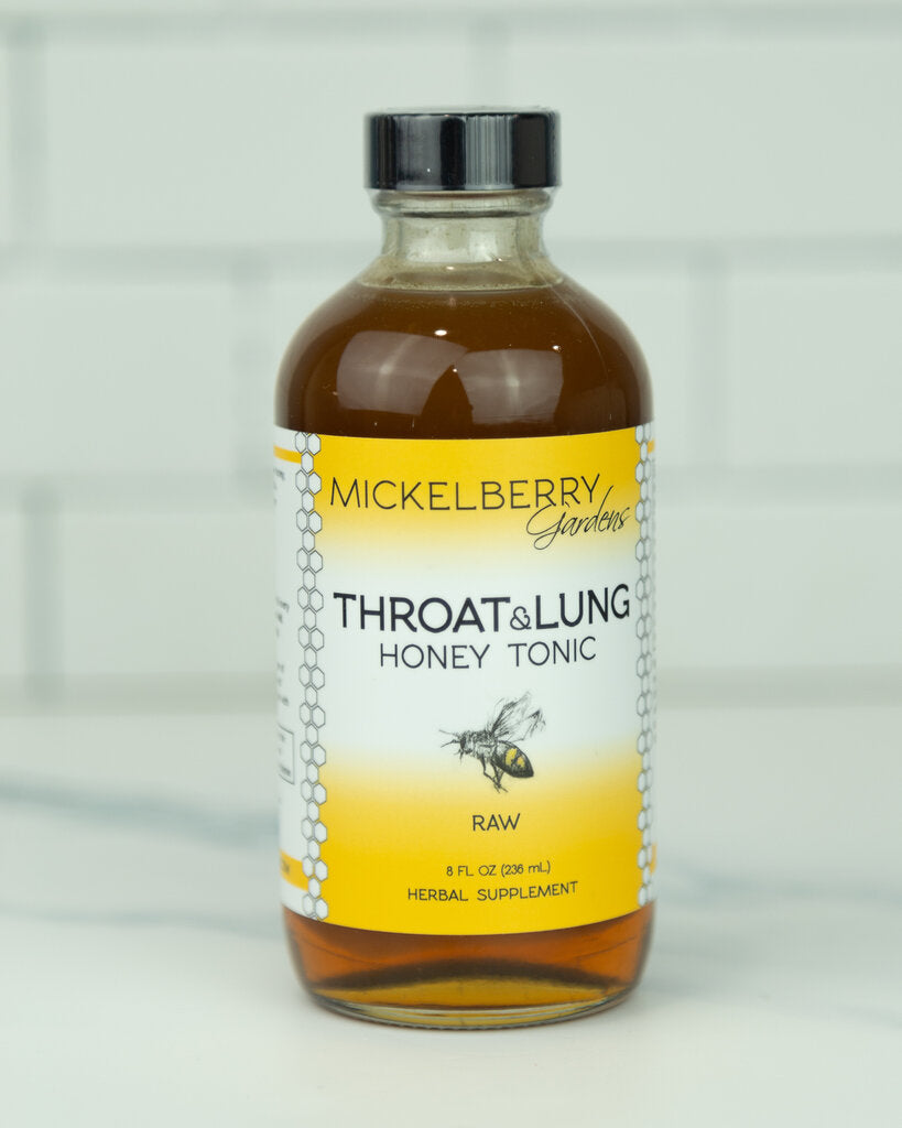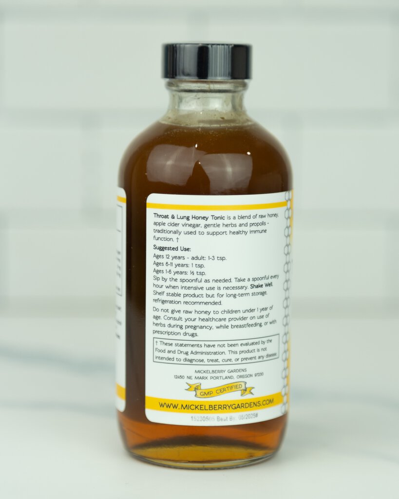 Glass bottle. Our honey tonics are designed to take by the spoonful or as needed. They're also delicious added to warm water, tea, or sparkling water. Mickelberry Gardens throat and lung honey tonic is a raw oxymel – made with local raw honey and raw apple cider vinegar. We source ingredients fresh, directly from pacific northwest growers and producers. We make all our products with strict attention to quality. Our facility is certified gmp-compliant, and is free of all major allergens, including gluten.