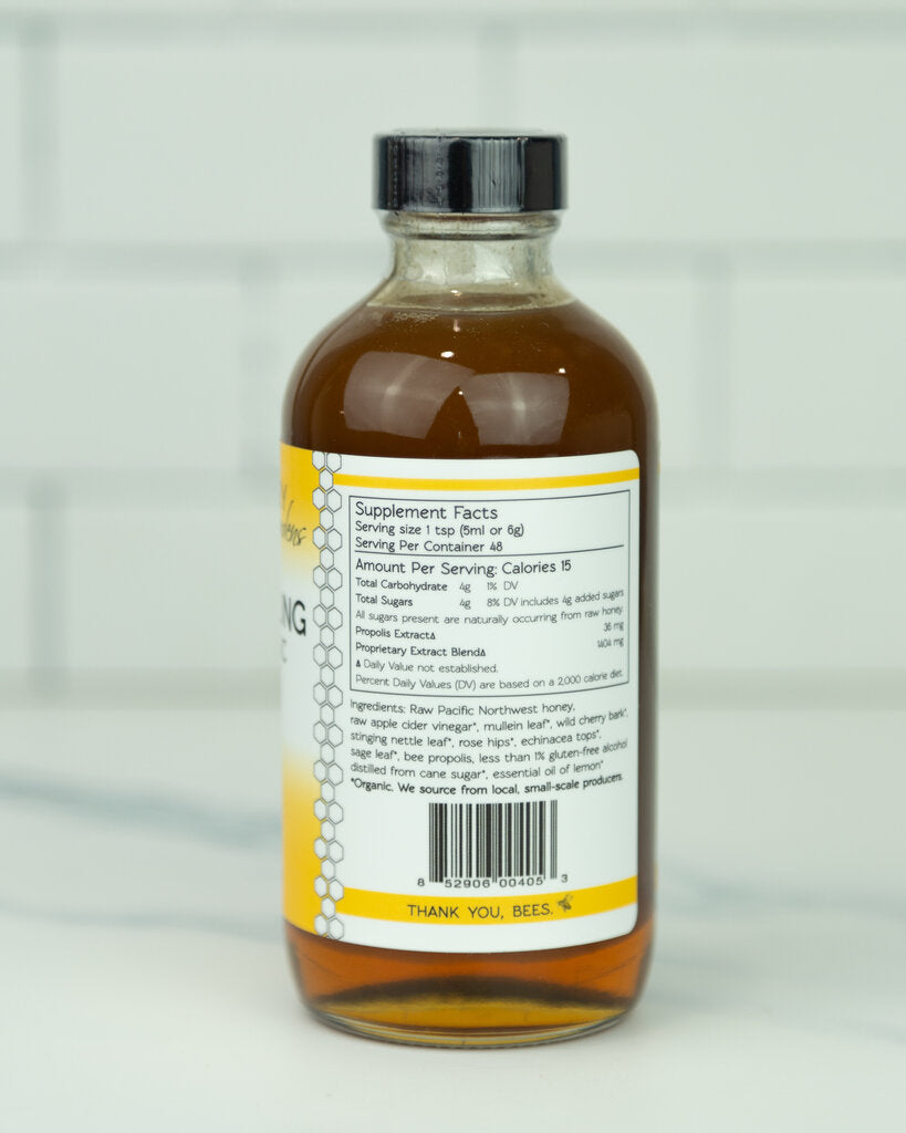 Raw Pacific Northwest honey, raw apple cider vinegar*, mullein leaf* (Verbascum thapsus), wild cherry bark* (Prunus serotina), stinging nettle leaf* (Urtica dioica), rose hips* (Rosa canina), Echinacea tops (Echinacea purpurea), sage leaf* (Salvia officinalis), bee propolis, less than 1% gluten free alcohol distilled from cane sugar*, and essential oil of lemon*. *certified organic